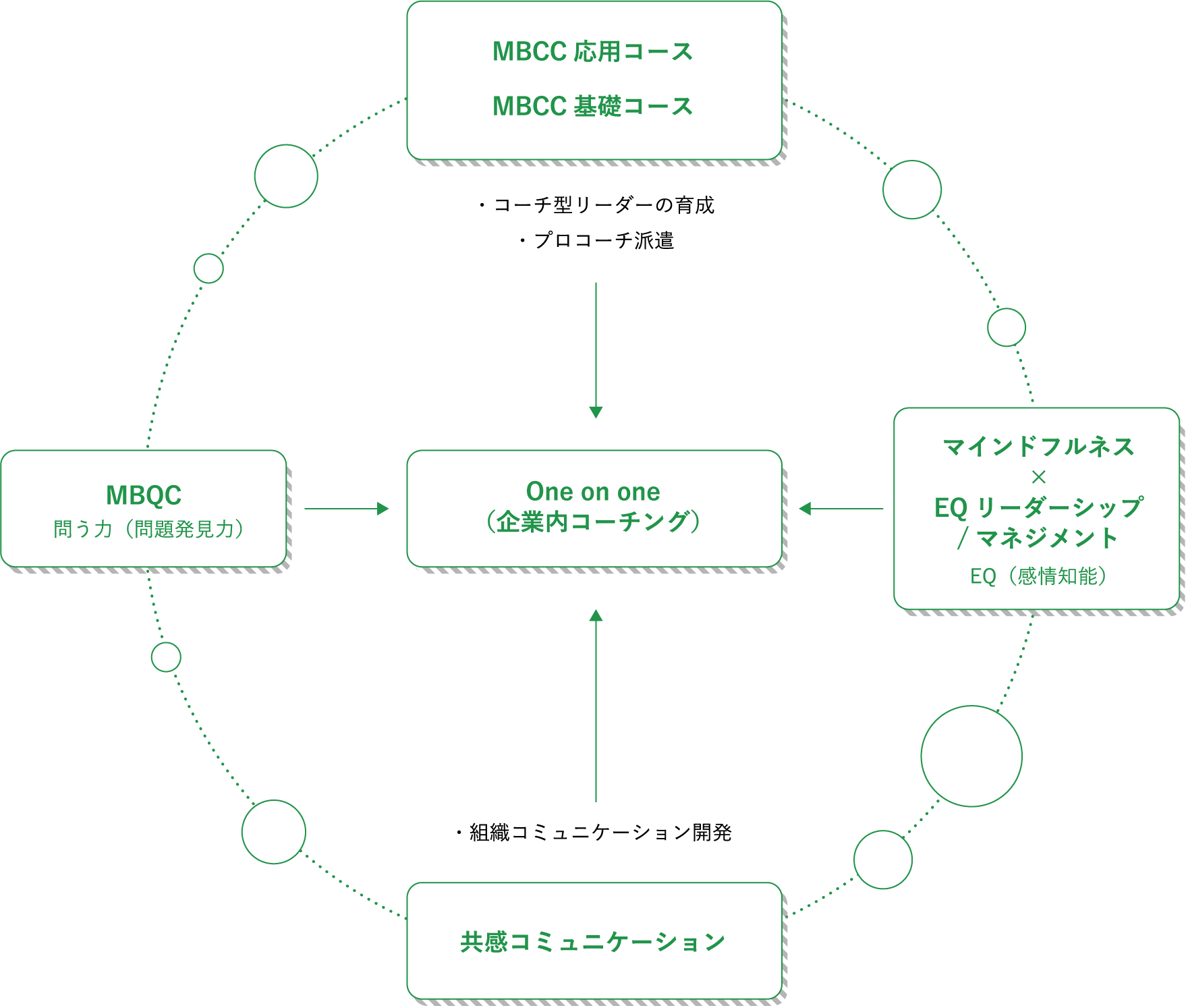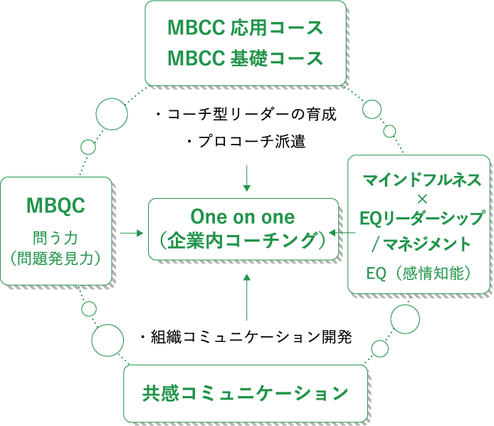 MBCCは基礎コース・応用コース(計125時間)のコーチング実践家養成プログラムを核とするコーチ育成、そのエッセンスを一般向けプログラムとした共感コミュニケーションを核とするコミュニケーション開発の2極があります。さらにこの2極からのアプローチを、効果的な面談の仕組化など企業内コーチングの導入と実践の支援に反映させています。また志を同じくするグローバルな組織と協力関係を結び、EQ(感情知能)やイノベーションの肝になる問う力(問題発見能力)の開発を推進しています。(EQは世界最大のEQトレーニング機関である6seconds、問う力の開発はRight Question Institute社)