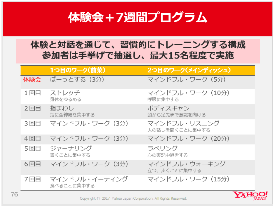 ヤフーでは、体験会(0回目)と、希望者に7週間のメタ認知プログラムを提供しています。内容は、図をご覧ください。