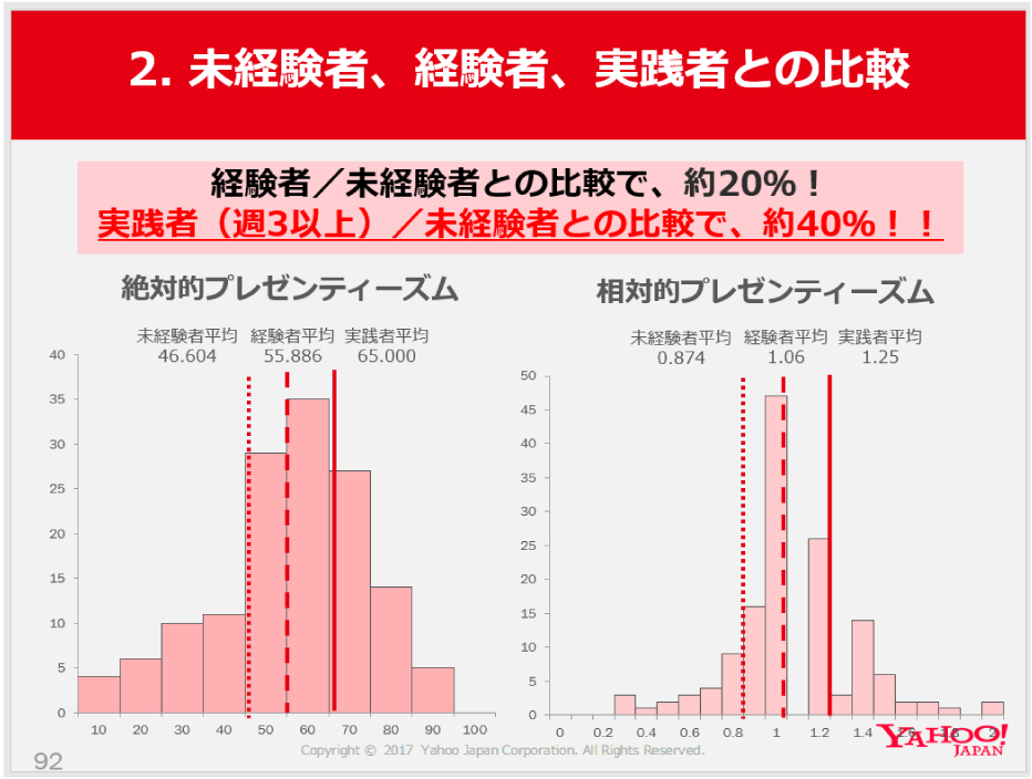 ヤフーでも、マインドフルネス経験者、実践者、未経験者にHPQの指標を用いて、自身の仕事のパフォーマンスについてアンケートを行いました。