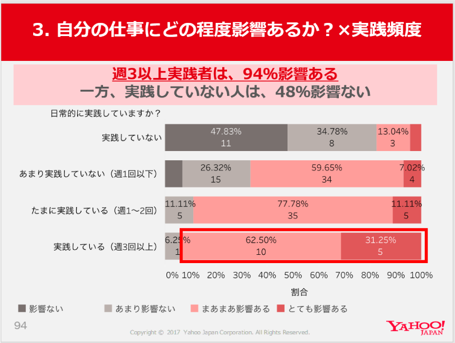週3回以上の実践者は、94%が「影響あり」