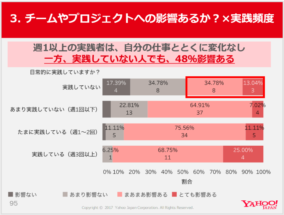 実践していない人でも、48%が「影響あり」と答えていることから、チームやプロジェクトへの影響が高いと認識していることがわかります。